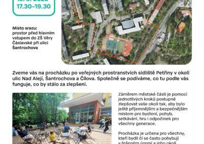 V pondělí 15. 9. 2025 proběhla procházka po veřejném prostranství Sídliště Petřiny, na které se se zástupci městské části dotazovali místních občanů, co v dané lokalitě funguje a co by stálo za zlepšení. Začátkem září také proběhl v rámci Zahradní slavnosti workshop pro děti na ZŠ Věry Čáslavské. Výstup společně s pracovní verzí analýzy území naleznete ZDE.